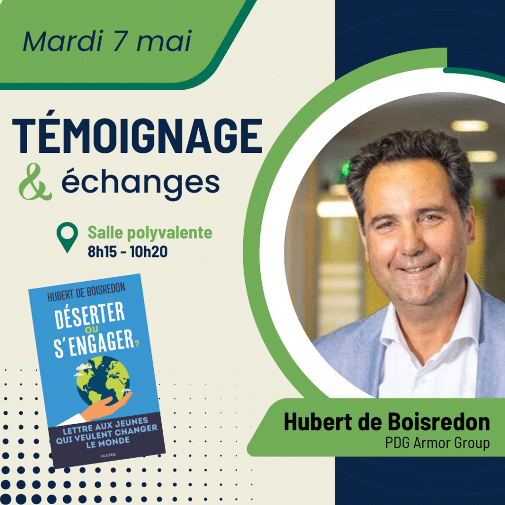 (minimum) par niveau. Différents temps forts ont été organisés ces dernières années : témoignage et réflexion sur la connaissance de soi et les talents par une coach, ou encore témoignage de vie et échanges avec Hubert de Boisredon, dirigeant d’Armor Group et écrivain, entre autres auteur de “Déserter ou s’engager ? : lettres aux jeunes qui veulent changer le monde”.